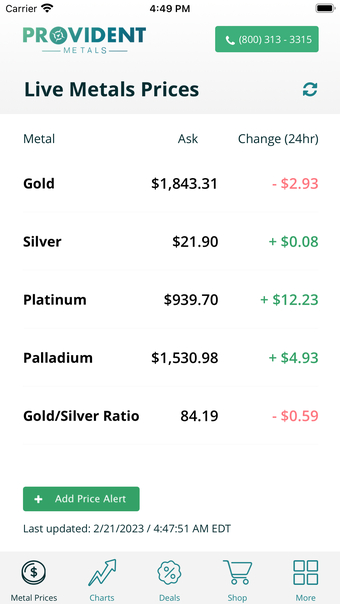 De Gold Silver Provident Metals app biedt real-time prijzen voor goud, zilver, platina en palladium. Met interactieve grafieken kunnen gebruikers de prijsbewegingen over verschillende tijdframes volgen, zoals 24 uur, 7 dagen, 1 maand en meer. De app stelt gebruikers in staat om aangepaste prijswaarschuwingen in te stellen, zodat ze direct een melding ontvangen via sms of e-mail wanneer de prijs van goud of zilver een vooraf ingesteld niveau bereikt. Dit maakt het een waardevol hulpmiddel voor iedereen die geïnteresseerd is in de edelmetaalmarkt.